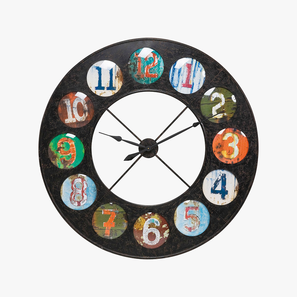 Wanduhr Vintage Coloure aus kreisförmigem Eisenrahmen mit bunten runden Zahlen und individuelle Farbzusammensetzung für jede Stunde als eigener Farbkreis. Papier hinter Glas und mit gefärbtem Hintergrund.