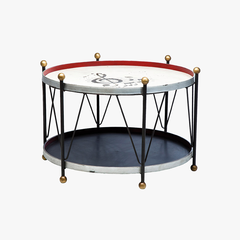 Origineller Couchtisch in Trommel-Optik. Der Tisch ist wie eine Trommel gestaltet und bietet dank des pfiffigen Designs sogar eine Ablagefläche für Zeitschriften und Co. Tischplatte mit Aufdruck verziert. Durchmesser 82 cm.